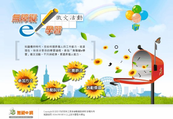 「無障礙e學習」徵文相關活動辦法,請見活動網站,網址是:http://openstudy.evta.gov.tw/10001_door/marketing/090629/ 。
