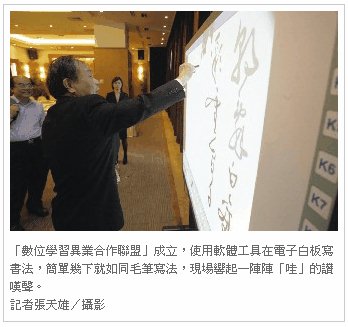 在昨天成立大會上,也展示了軟、硬體業者結合的示範,例如飛宏科技的電子白板與創意家的互動式內容合作案例,太瀚與一筆通「神來e筆」合作,可在電子白板上寫書法及作畫,讓學習者運用電子白板增強數位學習效果。