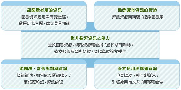本數位教材委託政治大學圖書資訊與檔案學研究所 楊美華教授、王梅玲教授、臺灣大學圖書資訊學系 謝寶煖教授、世新大學資訊傳播學系 莊道明教授,共同設計了五大主題18單元的教材內容,依照不同的學習情境模式分類如下所示: