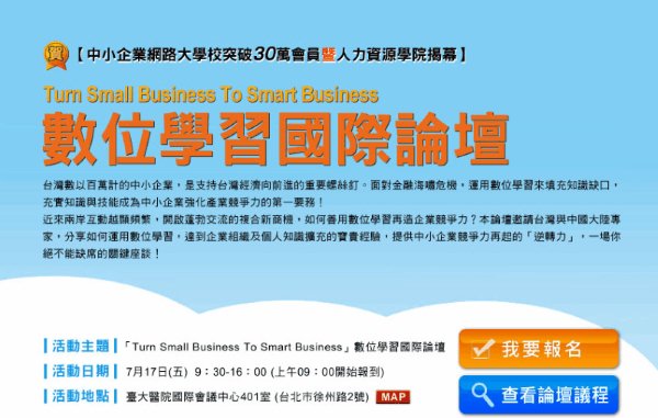 由經濟部中小企業處主辦,「中小企業網路大學校-Turn Small Business to Smart Business數位學習國際論壇」活動,17日在台大醫院國際會議中心舉行,邀請兩岸知名專家學者,分享數位學習的經驗與樂趣。